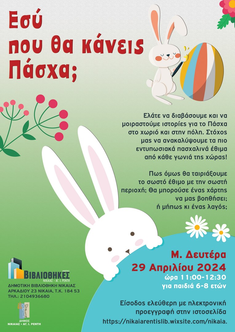 Ιστορίες για το Πάσχα στο χωριό και στην πόλη και έθιμα από κάθε γωνιά της χώρας θα αποκαλύψει η Δημοτική Βιβλιοθήκη Νίκαιας στους μικρούς της φίλους τη Μ. Δευτέρα 29 Απριλίου στις 11 το πρωί στο χώρο της (Αρκαδίου 23). Πώς όμως θα ταιριάξουμε το σωστό έθιμο με τη σωστή περιοχή; Θα μπορούσε ένας χάρτης να μας βοηθήσει; ή μήπως κι ένας λαγός; Η Πασχαλινή δράση «Εσύ που θα κάνεις Πάσχα;» απευθύνεται σε παιδιά ηλικίας 6-8 ετών. Η συμμετοχή είναι δωρεάν με απαραίτητη προεγγραφή https://forms.gle/KvTTCds6e1mrjYks9 .