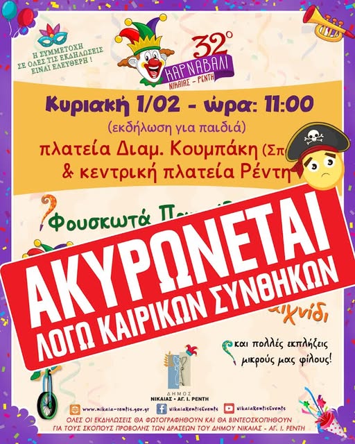 Ο Δήμος Νίκαιας- Αγίου Ιωάννη Ρέντη ανακοίνωσε την ακύρωση των προγραμματισμένων αποκριάτικων εκδηλώσεων για την Κυριακή 1η Φεβρουαρίου στις 11 π.μ., στις πλατείες Διαμάντως Κουμπάκη και Κεντρική πλατεία Ρέντη.
