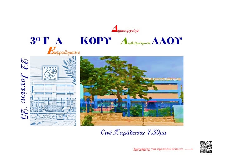 Με μια ξεχωριστή εκδήλωση στο Σινέ Παράδεισος (χειμερινή αίθουσα) ,το 3ο Λύκειο Κορυδαλλού – “Μελίνα Μερκούρη” μας καλεί να γνωρίσουμε από κοντά τι όμορφα πράγματα συμβαίνουν σ΄αυτό το σχολείο της πόλης μας: