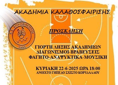 «Αν είσαι μέχρι 18 ετών έλα στη γιορτή λήξης των ακαδημιών μας ΑΠΡΟΒΛΕΠΤΟΙ ΑΣ (ΤΜΗΜΑ ΑΚΑΔΗΜΙΩΝ) να διασκεδάσεις μαζί μας και να λάβεις μέρος στους διαγωνισμούς βολών, μπασιμάτων, τριών πόντων κλπ», τονίζουν.