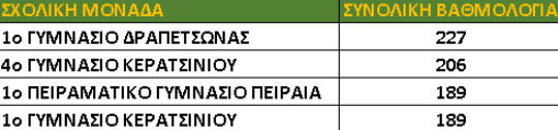 Τα τέσσερα σχολεία που συγκέντρωσαν τους περισσότερους βαθμούς, είναι τα εξής: