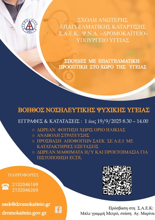Η Δημόσια Σχολή Ανώτερης Επαγγελματικής Κατάρτισης ( Σ.Α.Ε.Κ.) (πρώην Δ.Ι.Ε.Κ.), αποτελεί παράρτημα του Ψ.Ν.Α. «ΔΡΟΜΟΚΑΪΤΕΙΟ», στο οποίο λειτουργεί και τελεί υπό την εποπτεία και τον έλεγχο του Υπουργείου Υγείας.