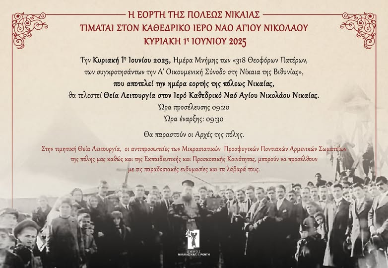 Την Κυριακή 1η Ιουνίου 2025, Ημέρα Μνήμης των «318 Θεοφόρων Πατέρων, των συγκροτησάντων την Α’ Οικουμενική Σύνοδο στη Νίκαια της Βιθυνίας», που αποτελεί την ημέρα εορτής της πόλεως Νικαίας, θα τελεστεί στις 9.30πμ, Θεία Λειτουργία στον Ιερό Καθεδρικό Ναό Αγίου Νικολάου Νικαίας.