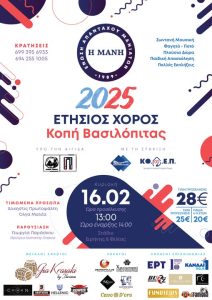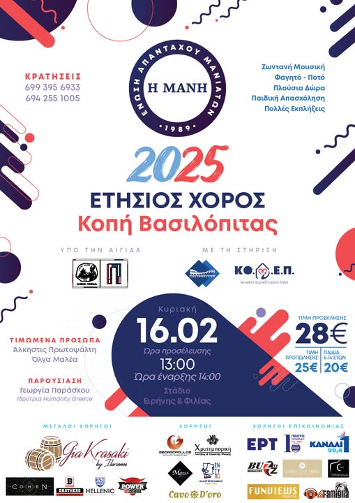 Η Ένωση Απανταχού Μανιατών «Η Μάνη» διοργανώνει τoν ετήσιο χορό για την κοπή της Πρωτοχρονιάτικης Βασιλόπιτας την Κυριακή, 16 Φεβρουαρίου στις 13:00 στο Στάδιο Ειρήνης και Φιλίας (Εκθεσιακός Χώρος).